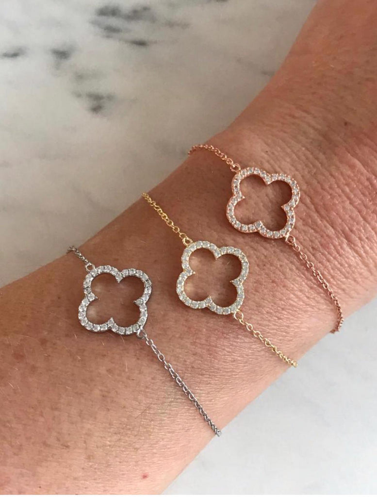 Close-up image of a sterling silver chain with a pave clover charm bracelet.