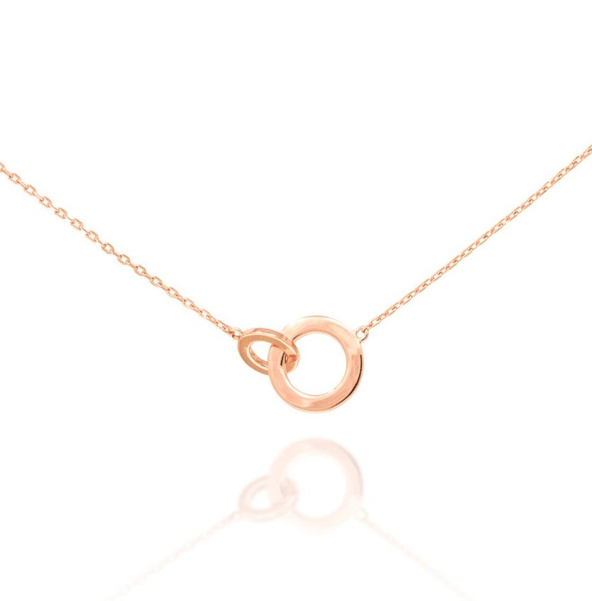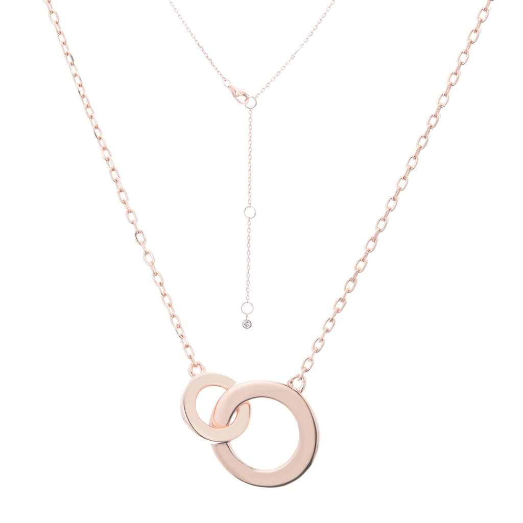 Elevate your elegance with our rose gold plated on silver intertwined circle necklace, combining modern minimalism with timeless sophistication. The delicate silver chain and intertwined circles symbolise endless love, making it perfect for any occasion.