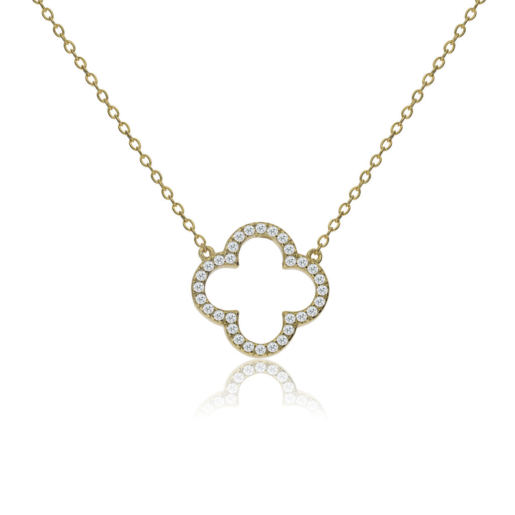 Discover elegance with our Gold Plated on Silver Chain Necklace, featuring a cubic zirconia-paved clover charm. Measuring 1.5 cm by 1.5 cm, this 44 cm adjustable necklace adds sophistication and charm to any outfit, symbolising good luck and prosperity.