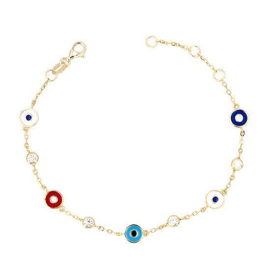 Elevate your jewellery collection with this gold-plated silver bracelet, featuring vibrant enamelled discs, dazzling CZ stones, and an adjustable length. Perfect for any occasion, it combines traditional charm with modern sophistication for a timeless treasure.