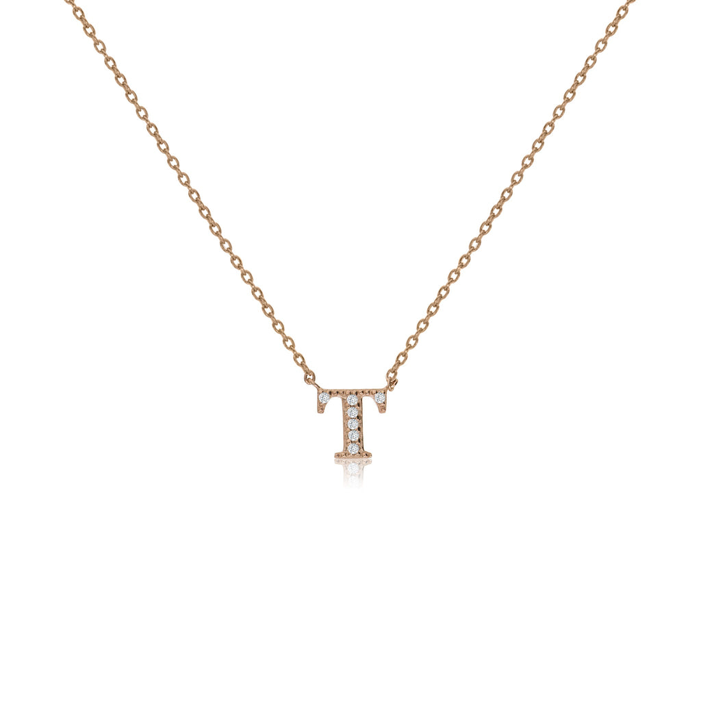 Rose Gold on Silver Initial Necklace with CZ Decoration - Initial 'T'